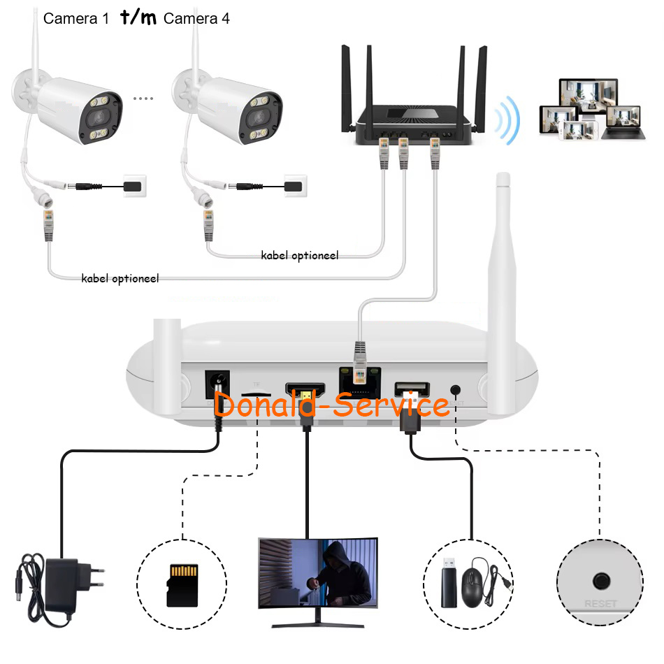 De camera’s zijn draadloos naar de recorder toe maar de recorder heeft wel een kabel nodig naar het internet.
